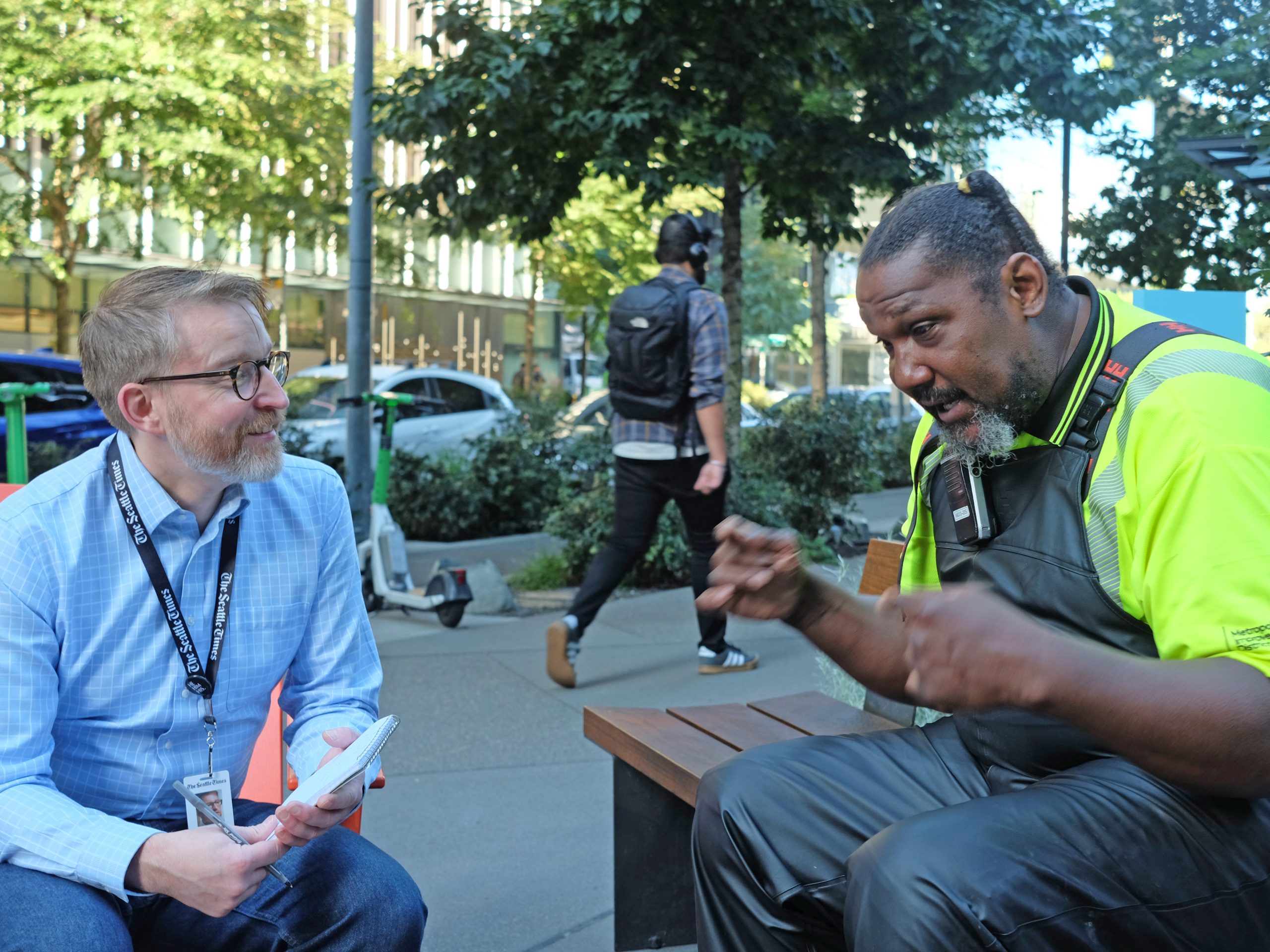 The Seattle Times produced a story about the changing nature of the Denny Triangle and South Lake Union neighborhoods over the past 18 years. As the tech sector has grown substantially over past two decades, so too have those two neighborhoods and many longtime Seattleites have observed these shifts. DSA/MID Clean Team Field Operator Al Wells sat down with Levi Pulkkenin (pictured above), business editor at the paper, to talk about the evolution of these sections of downtown. Click here to read the story.